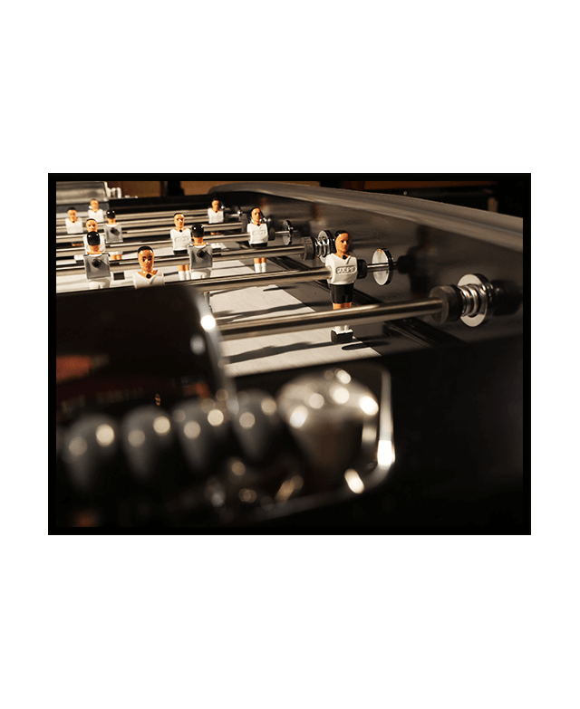 Die schwarz gebeizte Oberfläche besteht aus einem schwarz getönten Lack, der die Holzmaserung je nach Lichteinfall leicht sichtbar macht (im Gegensatz zu Lack). Dieser Farbton in einer harmonischen Kombination (graue Handläufe, graue Gerflex-Spielfläche, schwarz lackierte Füße usw.) verleiht dem Tischfußball Modernität und setzt einen Kontrapunkt zum üblichen Stil. Die Wahl des schwarz gebeizten Evolution-Tischfußballs eignet sich ideal für eine Dekoration im urbanen, industriellen oder Werkstattstil oder einfach, um einen Vintage- und freundlichen Touch zu verleihen.