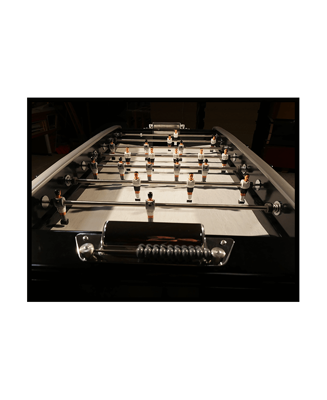 Tischfußball, wie man ihn aus Cafés kennt! Mit seiner zentralen Rückführung, seiner flachen Gerflex-Spielfläche mit schrägen Winkeln, seinen Teleskopstangen, seinen echten Lagern, seinen Gusseisenspielern und seinem massiven Buchengehäuse ist der Sulpie Evolution Tischfußball ein echter Tischfußball, der dem französischen Spiel entspricht, wie man ihn in vielen Cafés der 60er bis 80er Jahre fand. Mit diesem wertvollen Know-how und der Auswahl hochwertiger Materialien ist der Sulpie Tischfußball für Tischfußballspieler und dank seiner vielfältigen Anpassungsmöglichkeiten für viele Dekorationen von großem Interesse.